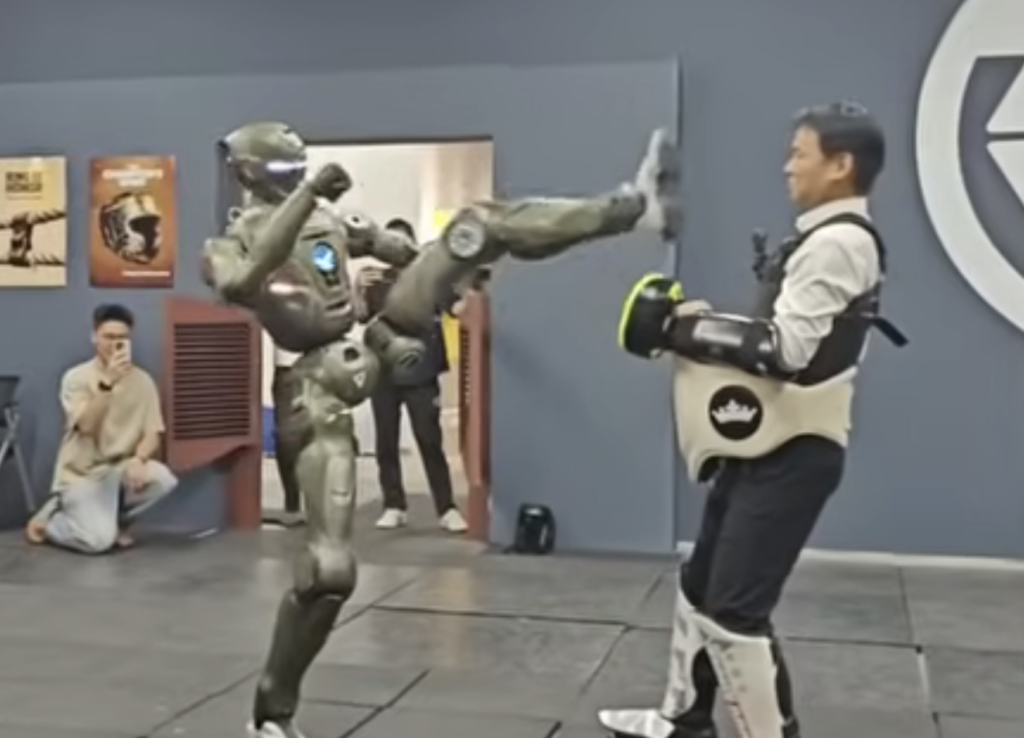 After putting on what looks like way too little protective equipment, Engine AI CEO Zhao Tongyang quickly got into it with the T800, which wasted no time in trying to kick his head off. Tongyang backs up before this actually happens, and there’s a good chance that those testing him also held back since they assumed that his dying words probably wouldn’t be “good job, you’re getting a bonus.” Either way, the CEO gamely squared off with the robot again, which kicked him hard enough in the stomach to knock him down.