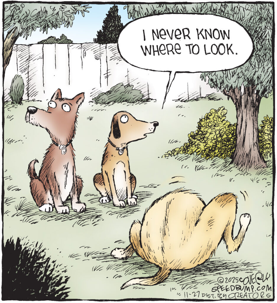 About Dave Coverly – Dave Coverly, creator of the syndicated cartoon Speed Bump, captures life’s humorous “outtakes” in over 400 newspapers worldwide, including The Washington Post and Chicago Tribune. A graduate of Eastern Michigan University and Indiana University, Coverly’s award-winning work has appeared in The New Yorker, Parade Magazine, and various textbooks, greeting cards, and merchandise. Honored with the National Cartoonists Society’s Reuben Award in 2009, Coverly’s art is exhibited internationally and cherished by luminaries like Anderson Cooper. He resides in Ann Arbor, Michigan, with his wife, Chris, and their daughters, Alayna and Simone, creating cartoons from his attic studio.